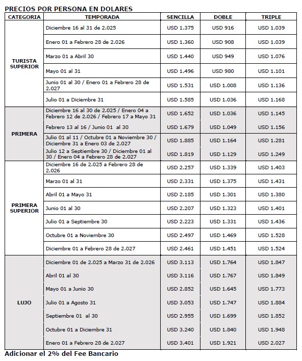 IMPORTANTE: Es responsabilidad de cada viajero, ir provisto de su pasaporte y documento de identidad preciso, vigente y dotado de todos los visados y requisitos necesarios, declinando las agencias prestatarias de servicios y operadores, toda responsabilidad, en el caso de ser rechazada por alguna autoridad la entrada en un País, por carecer de algunos de los requisitos que se precisen o defecto en el pasaporte, y será por cuenta del viajero cualquier gasto que se origine, aplicándose en estas circunstancias las condiciones establecidas para la cancelación y rechazo voluntario de los servicios.