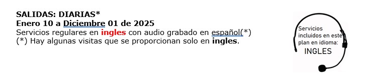 (*) Las aplicaciones o audios pregrabados requiere que los clientes tengan un conocimiento minimo de ingles para ponerlas en funcionamiento en el momento en que el guía lo indique para que el audio sea compatible con las explicaciones y el recorrido organizado (el operador local no acepta reclamaciones por la no utilización o errónea de los audios por parte de los clientes)