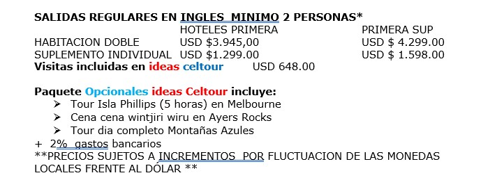 Descubrir un país que es un continente es embarcarse en toda una aventura ya que en este destino en pocas horas de vuelo pasamos de una ciudad moderna como Melbourne a estar en medio del desierto árido mas extremo del mundo y donde los aborígenes locales aun son dueños de su destino y nos enseñan como se debe cuidar el planeta, o bien el las costas de Cairns a los pies de la Gran Muralla de Coral una de las maravillas de la naturaleza y terminar en la bella Sydney una de las mas cosmopolitas ciudades de Oceanía y rodeada de una de las bahías mas reconocidas del mundo y toda una urbe moderna.