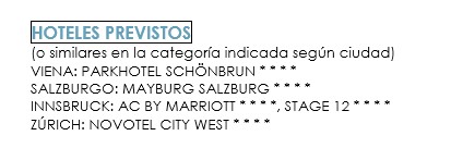 LOS HOTELES MENCIONADOS COMO PREVISTOS ESTAN SUJETOS A VARIACION. EN EL CASO DE QUE EL ORGANIZADOR DEBIERA AMPLIAR LAS RESERVAS, POR SOBREPASAR EL CUPO BASICO LOS CLIENTES QUE VIAJEN EN EL SEGUNDO O SUCESIVOS AUTOCARES SERAN ALOJADOS EN LOS HOTELES PREVISTOS, Y EN SU DEFECTO EN HOTELES SIMILARES EN CATEGORIA Y PRECIO.