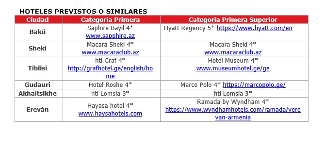– 8 noches de alojamiento en Azerbayan y Georgia en los hoteles previstos o similares, en habitaciones Standard con baño/ducha