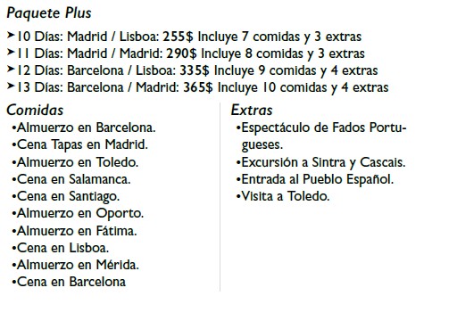programa. Dichas excursiones serán ofrecidas al consumidor con sus condiciones específicas y precio definitivo de forma independiente, no garantizándose hasta el momento de la posible realización de las mismas. En la mayoría de los programas incluidos en este catálogo se ofrece al consumidor la posibilidad de opcionalmente comprar un paquete de excursiones, visitas y comidas que se ha denominado paquete Plus, cuyo precio y contenido varía en función del programa.