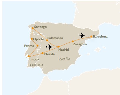 Descubriendo: Barcelona (2) / Zaragoza / Madrid (3) / Segovia / Ávila / Salamanca (1) / Santiago de Compostela (1) / Viana do Castelo/ Oporto (2) / Aveiro / Fátima / Lisboa (2) / Mérida