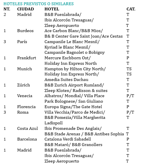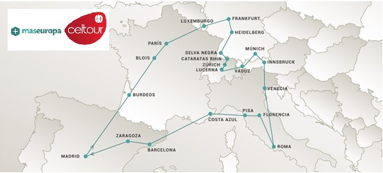 Madrid – Burdeos – París – Luxemburgo – Rin – Frankfurt – Heidelberg – Selva Negra – Zúrich – Lucerna – Múnich – Innsbruck – Venecia – Roma – Florencia – Pisa – Costa Azul – Barcelona – Madrid