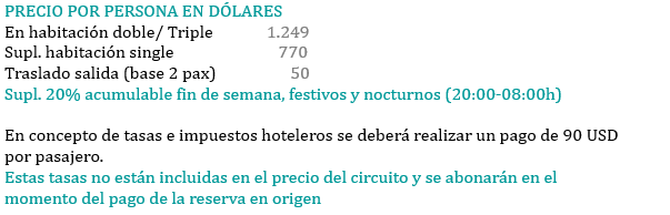 SERA RESPONSABILIDAD DEL VIAJERO Y SU AGENCIA DE VIAJES CUMPLIMENTAR TODOS LOS REQUERIMIENTOS SANITARIOS REQUERIDOS PARA ESTE VIAJE YA SEA EN EL PAIS DE DESTINO COMO PAIS DE CONEXION (SI CORRESPONDE). VIAJES CELTOUR DARA INFORMACION BASICA GENERAL ANTICIPADA PERO TENIENDO EN CUENTA LOS CAMBIOS FRECUENTES DE LAS CONDICIONES DE ENTRADA DEBERAN SER CONSULTADAS CONSTANTEMENTE POR PARTE DEL VIAJERO DIAS ANTES DE LA SALIDA