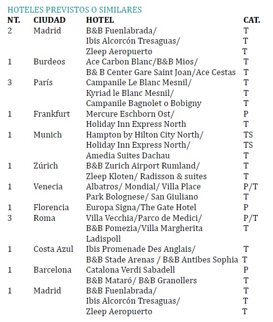 Madrid – Burdeos – París – Luxemburgo – Rin – Frankfurt – Heidelberg – Selva Negra – Zúrich – Lucerna – Múnich – Innsbruck – Venecia – Roma – Florencia – Pisa – Costa Azul – Barcelona – Madrid