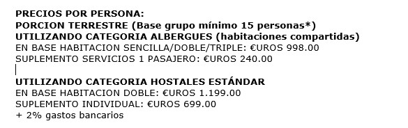 • Traslado de equipaje durante las etapas (máximo 20 kgs por persona en una sola maleta)