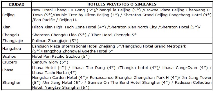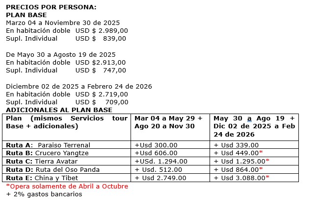 Visitas con guías locales de habla hispana excepto en Zhangjiajie, Crucero del Yantgze Chengdu y Lhasa donde será guía de habla Inglesa en servicio regular compartido.
