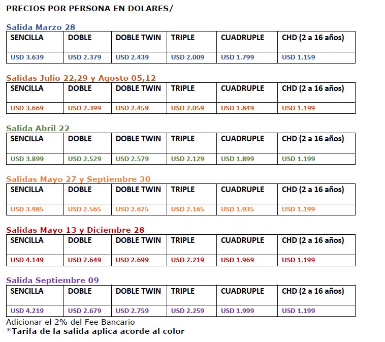 ** A todos los precios informados en este folleto es necesario incrementar el 2% del fee bancario **