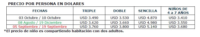 • El pago total debe realizarse 50 días antes del inicio del viaje. De lo contrario se perderá el cupo.