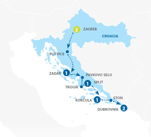 – Entradas: Pueblo Rastoke; Parque Nacional de Plitvice; Split el Palacio de Diocleciano, la Catedral y Templo de Jupiter; Korčula – la Catedral; Dubrovnik – la catedral y Monasterio Franciscano.