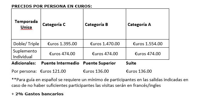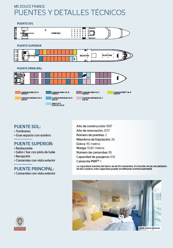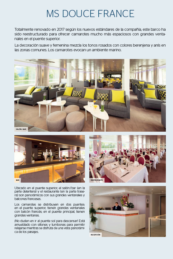 • 4 noches de alojamiento a bordo de un crucero 4 anclas* M/S DOUCE FRANCE en camarote doble con baño completo según opción elegida.