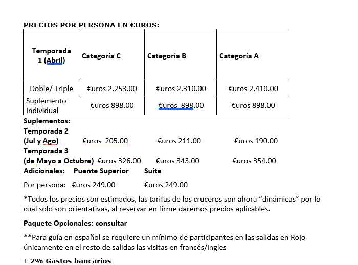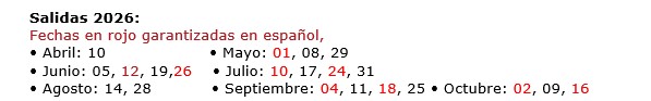 • Coordinadora de habla hispana durante todo el itinerario solo en las salidas marcadas en rojo, el resto de salida con tripulación de habla Francesa/inglesa.