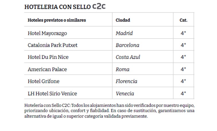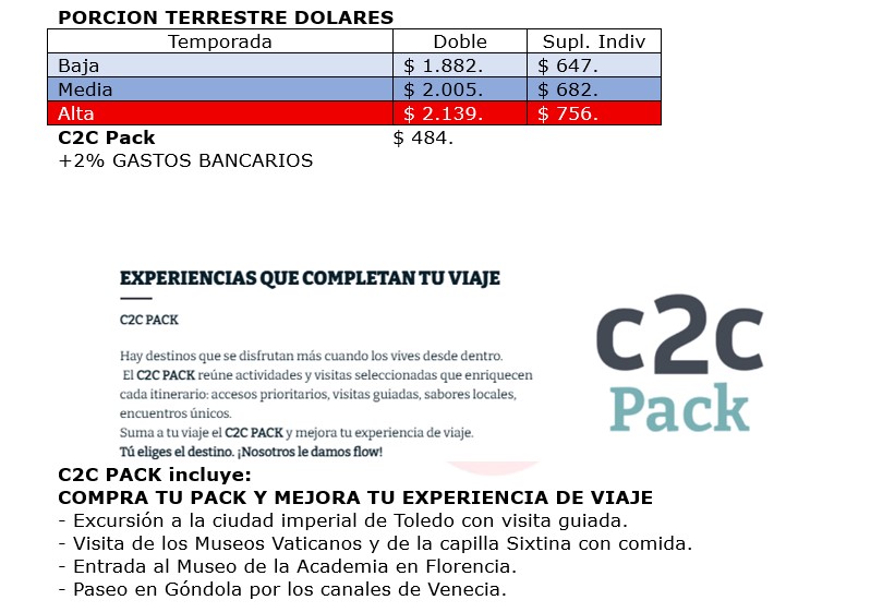 – Visitas mencionadas como incluidas en el C2C PACK (es válido si se agrega a la reserva desde el país de origen)