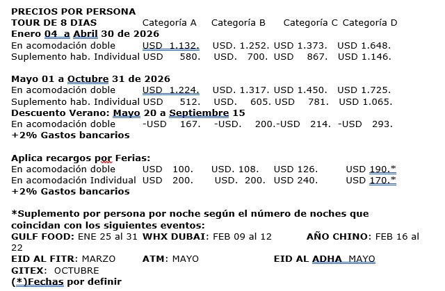 Desayuno. Comenzamos el recorrido en ruta al EMIRATO DE RAS AL KHAIMAH, visitamos primero el tradicional Mercado Masafi, creado por los propios comerciantes en el camino, y llegamos a la Fortaleza Masafi, construida en el siglo XV, la mejor conservada del país. Nos dirigimos a una de las regiones más interesantes del país, parte del EMIRATO DE SHARJAH, las impresionantes montañas de Khorfakkan, y observamos la Laguna de Rafisah, una de las más grandes y hermosas del Golfo Arábigo. Finalmente llegamos al Golfo de Omán, donde comienza el Océano Índico, visitando el Mercado y Museo de Artesanía, así como las Cascadas de Khorfakkan. Almuerzo Esta parte del recorrido nos permite ver la ciudad más antigua de la costa del Golfo de Omán, donde tuvieron lugar muchas batallas históricas. En el tercer y último capítulo de este viaje llegamos al EMIRATO DE FUJAIRAH, el único situado íntegramente en la costa este del país, donde visitamos la Mezquita Al Bidiya, la más antigua del país, de 1446, y finalizamos en un resort local para almorzar y disfrutar de la playa del océano. Al regresar al hotel pasamos por el EMIRATO DE UMM AL QUWAIN y el EMIRATO DE AJMAN, completando así 5 Emiratos en un solo día. Regreso al hotel y alojamiento. Regreso a Dubai y alojamiento
