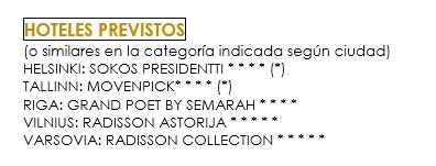 LOS HOTELES MENCIONADOS COMO PREVISTOS ESTAN SUJETOS A VARIACION. EN EL CASO DE QUE EL ORGANIZADOR DEBIERA AMPLIAR LAS RESERVAS, POR SOBREPASAR EL CUPO BASICO LOS CLIENTES QUE VIAJEN EN EL SEGUNDO O SUCESIVOS AUTOCARES SERAN ALOJADOS EN LOS HOTELES PREVISTOS, Y EN SU DEFECTO EN HOTELES SIMILARES EN CATEGORIA Y PRECIO.