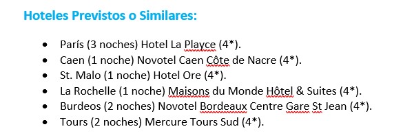 • En la salida del 13 de septiembre, debido a la celebración del Festival de la Fiction en La Rochelle, el alojamiento del día 5 del programa podrá ser en otra localidad cercana dentro de la misma región.