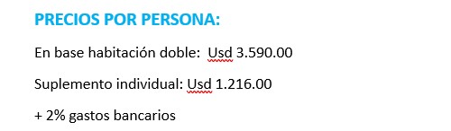•Visitas mencionadas como opcionales o las que el guía correo ofrezca para aprovechar el tiempo libre.