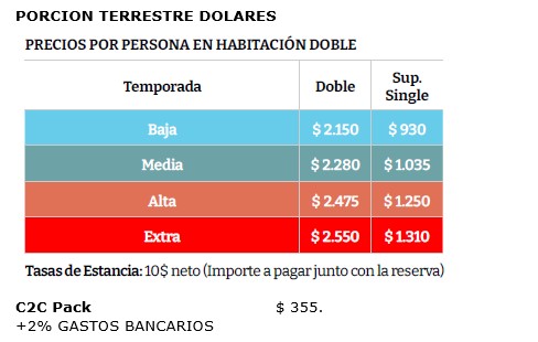 – Tasas de estancias (city tax) se liquidan al momento de confirmar las plazas y se pagan con el valor total del tour