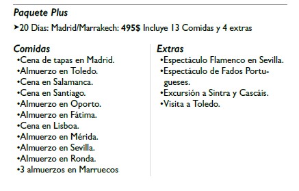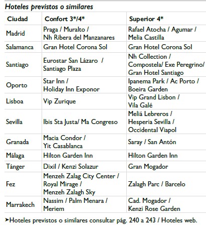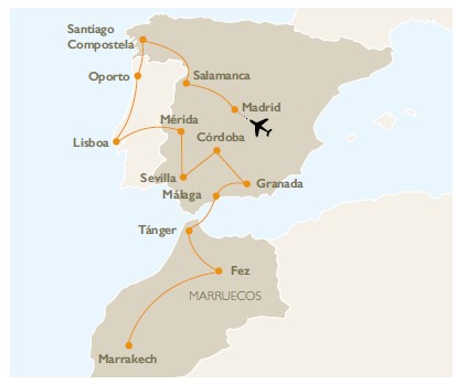 Descubriendo: Madrid (2) / Segovia / Ávila / Salamanca (1) / Santiago de Compostela (1) / Viana do Castelo / Oporto (2) / Aveiro / Fátima / Lisboa (2) / Mérida / Sevilla (2) / Córdoba /Granada (1) / Málaga (Costa del Sol) (2) / Algeciras /Tánger (1)/ Meknes / Xaouen /Fez (2) Ifran / Beni Mellal / Marrakech (2)