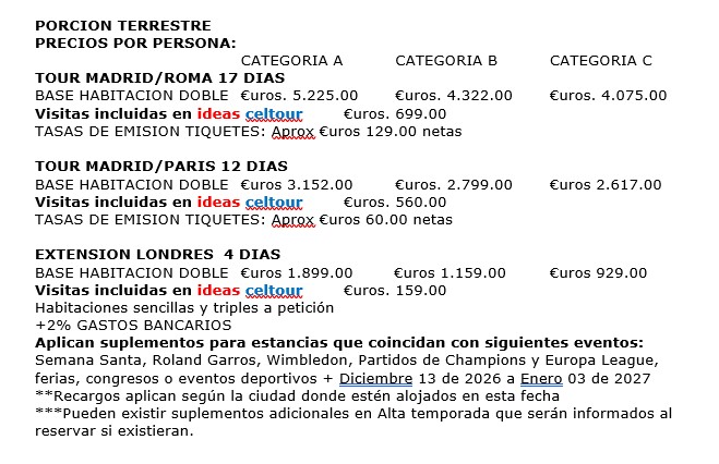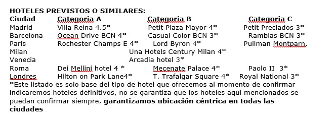 *Si desea esta extensión se haría desde Paris y la estadía en Roma seria de Viernes a Martes (mismos servicios del plan básico)