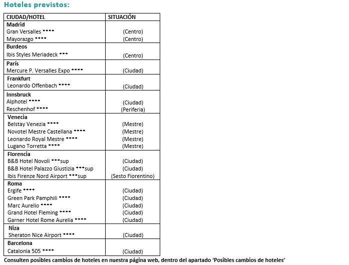 • Es posible que, en algunas salidas, el trayecto Madrid-Paris se realice en avión, cambiando la noche de Burdeos por 1 noche más en París. En estos casos, la visita de Madrid podría realizarse en Bus Turístico Hop On Hop Off o visita a pie con guía local.