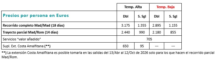 • En el caso de reservar “valor añadido” y Ext. Costa Amalfitana, les rogamos consulten importe a descontar sobre el precio publicado.