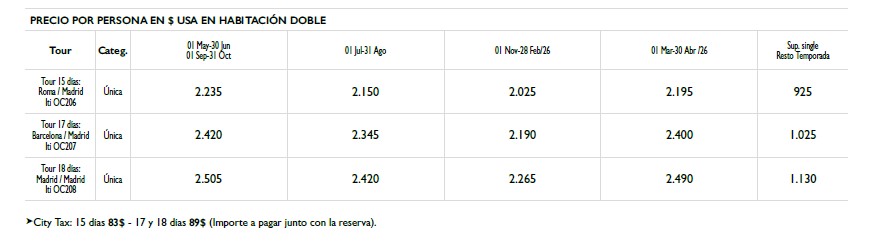 Incluye 6 comidas y 6 extras – 17 días: Barcelona / Madrid: Incluye 7 comidas y 6 extras – 18 días: Madrid / Madrid: Incluye 7 comidas y 6 extras