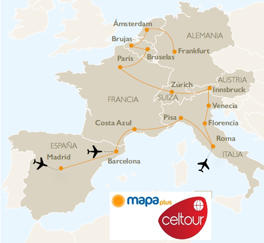 El tour que hace la ruta a la inversa de la mayoría desde Madrid se va por la Costa Azul a Italia y luego por Suiza a Paris desde donde se toma el recorrido de los conocidos como “paises Bajos” donde hoy día se admiran algunas de las ciudades mas bellas del viejo continente como Brujas