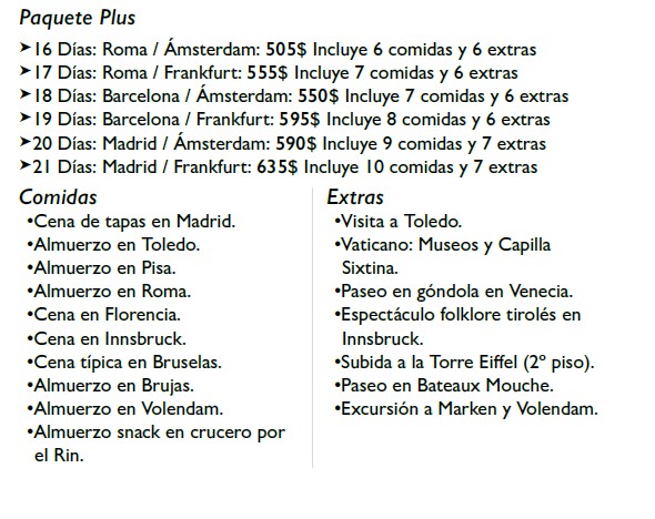 programa. Dichas excursiones serán ofrecidas al consumidor con sus condiciones específicas y precio definitivo de forma independiente, no garantizándose hasta el momento de la posible realización de las mismas. En la mayoría de los programas incluidos en este catálogo se ofrece al consumidor la posibilidad de opcionalmente comprar un paquete de excursiones, visitas y comidas que se ha denominado paquete Plus, cuyo precio y contenido varía en función del programa.