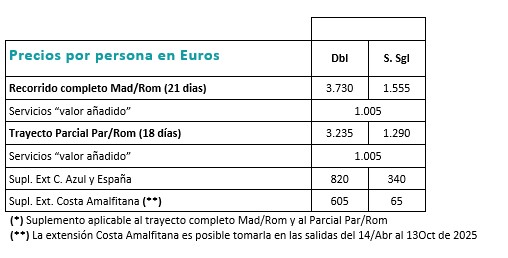• En el caso de reservar “valor añadido” y Ext. Costa Amalfitana, les rogamos consulten importe a descontar sobre el precio publicado.