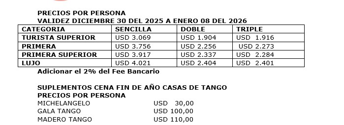 Disfrute de la cena de Año Nuevo en uno de los salones de Cena Show mas reconocidos de Buenos Aires “La Ventana”. Reciba el nuevo año al ritmo del Tango y luego disfrute de la cosmopolita Buenos Aires antes de viajar a la campiña de Bariloche e iniciar el cruce de la zona de lagos que separa a Argentina de Chile y que cuenta con algunos de las estampas mas hermosas de la naturaleza, finalmente se llega Santiago la siempre viva capital Chilena como colofón de un viaje único.