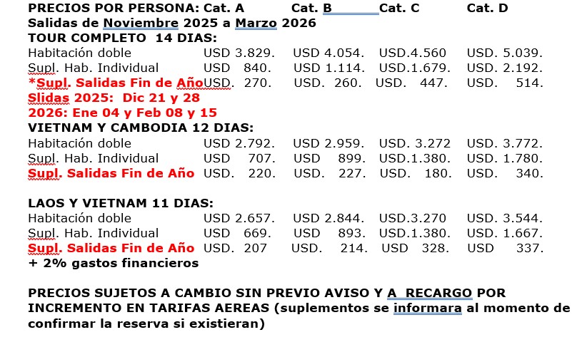 Indochina se conoce a la zona que comprende los Países de Laos, Vietnam, Cambodia, Myanmar y Thailandia, estos países algunos limítrofes han tenido en los últimos años un crecimiento de visitantes debido a sus tesoros tanto arquitectónicos, naturales; como a su estilo de vida, aun cuando vecinos cada país ofrece al turista la posibilidad de disfrutar cada tribu, cada religión o tradición lo que hace de este un viaje especial por lo panorámico como por lo espiritual