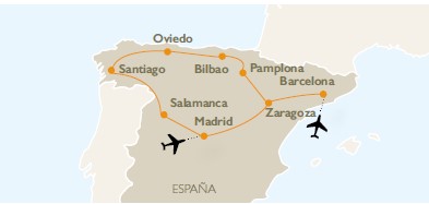 Descubriendo: Barcelona (2) / Pamplona (1) / San Sebastián / Bilbao o Santander (1) / Santillana / Covadonga / Oviedo (1) / Santiago de Compostela (1) / Salamanca (1) / Madrid (2-3)