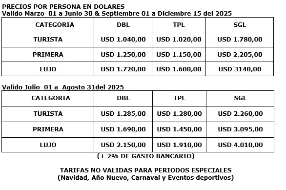 IMPORTANTE: Es responsabilidad de cada viajero, ir provisto de su pasaporte y documento de identidad preciso, vigente y dotado de todos los visados y requisitos necesarios, declinando las agencias prestatarias de servicios y operadores, toda responsabilidad, en el caso de ser rechazada por alguna autoridad la entrada en un País, por carecer de algunos de los requisitos que se precisen o defecto en el pasaporte, y será por cuenta del viajero cualquier gasto que se origine, aplicándose en estas circunstancias las condiciones establecidas para la cancelación y rechazo voluntario de los servicios.