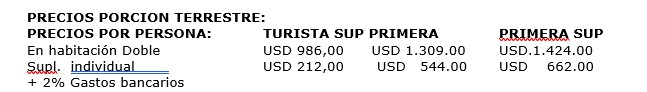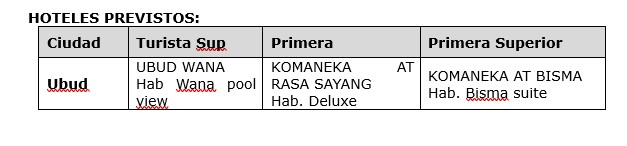 – En general ningún servicio que no esté claramente estipulado en el presente itinerario