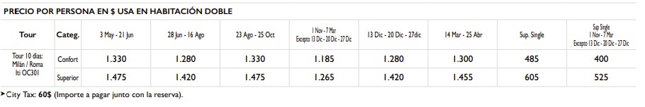 10 Días: Milán / Roma: 390$ Incluye 5 comidas y 2 extras