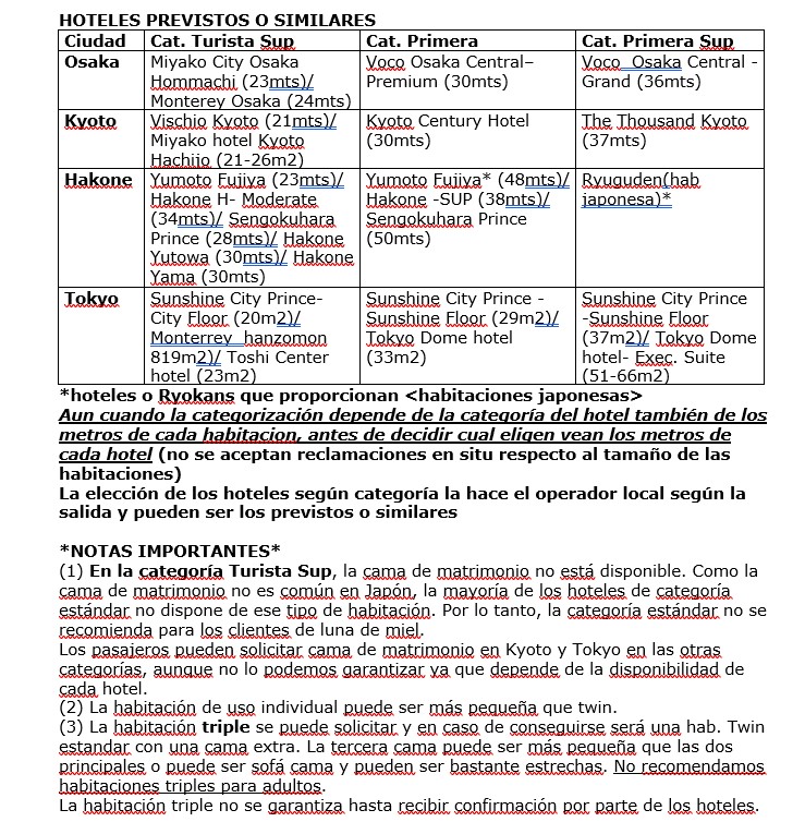 *Nota: Dependiendo de las condiciones climatológicas, las visitas pueden ser sustituidas por otras como museos y/o templos. Respecto a la vista panorámica del Monte Fuji también dependerá de la meteorología. Es muy difícil ver el Monte Fuji en cualquier época del año y sobre todo en verano porque suele estar nebuloso.