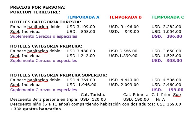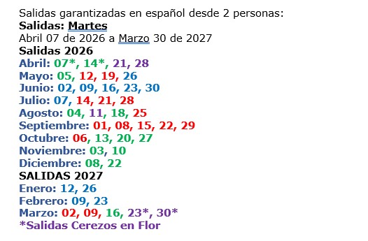 Las salidas mencionadas como Cerezos en Flor o Colores Otoñales estan relacionadas con un fenómeno natural no se garantiza al 100% la coincidencia del fenómeno en la salida elegida