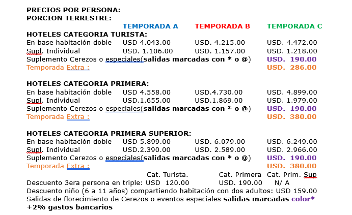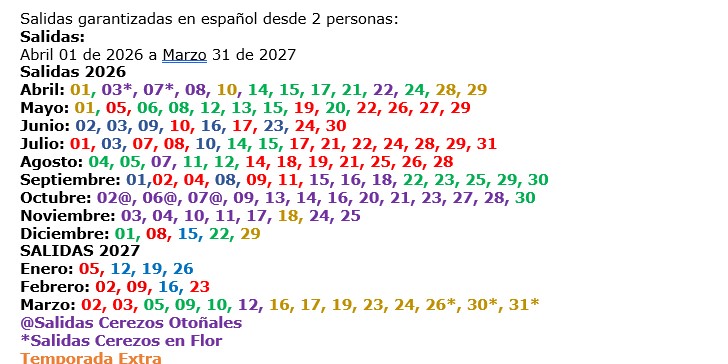Las salidas mencionadas como Cerezos en Flor o Colores Otoñales estan relacionadas con un fenómeno natural no se garantiza al 100% la coincidencia del fenómeno en la salida elegida