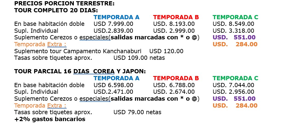 Las salidas mencionadas como Cerezos en Flor y Cerezos Otoñales estan relacionadas con un fenómeno natural no se garantiza al 100% la coincidencia del fenómeno en la salida elegida