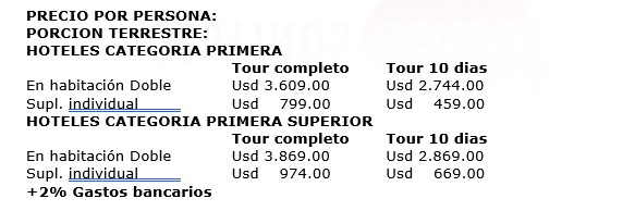 La organización de estos viajes combinados ha sido realizado por VIAJES CELTOUR operador mayorista con Registro Nacional de Turismo 3487, y/o sus operadores locales, se hace responsable ante los usuarios por la total prestación de servicios descritos en el presente folleto
