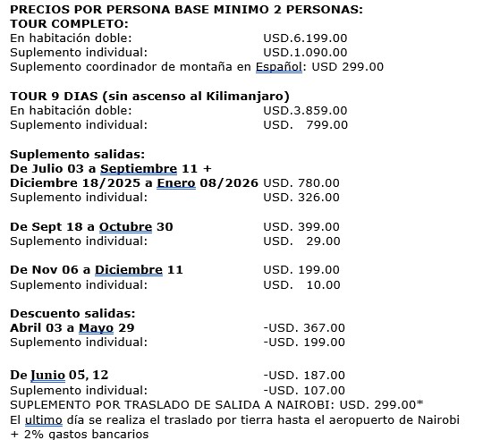 *posibilidad de agregar regreso privado por tierra a Nairobi (costo extra No incluido) en este caso vuelo debe ser posterior a las 22:00 hrs