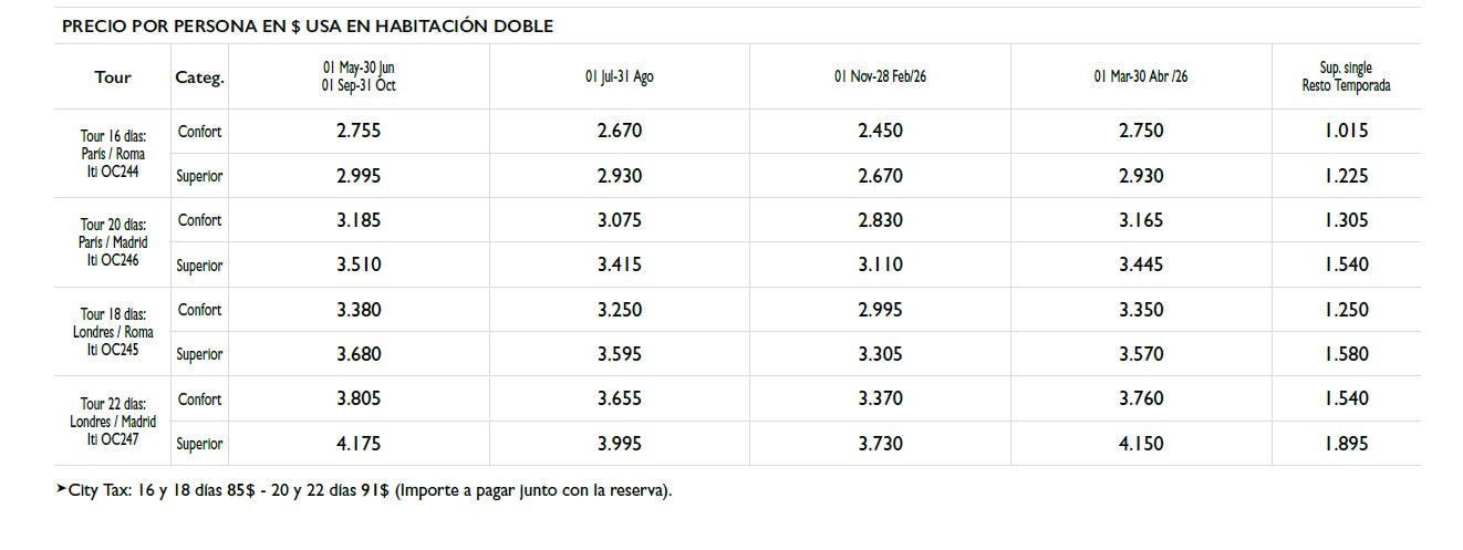Paquete Plus: 16 ó 18 Días: París ó Londres / Roma: Incluye 6 Comidas y 6 Extras