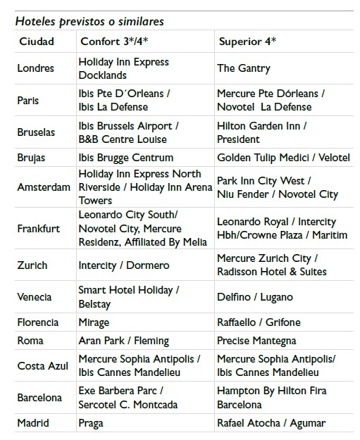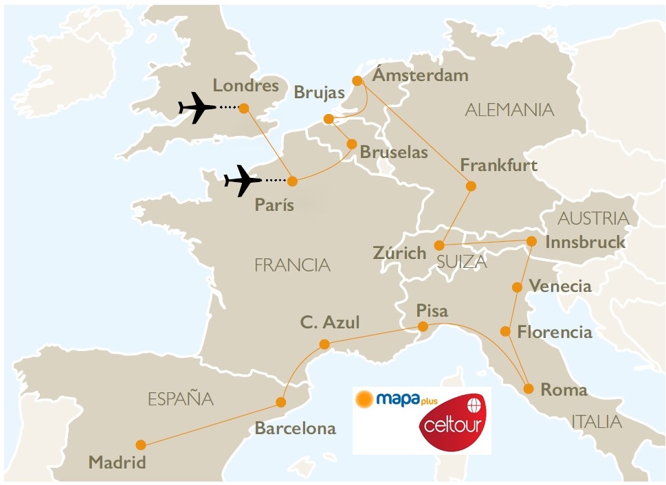 Traslados del aeropuerto al hotel y viceversa. Alojamiento y desayuno buffet durante todo el recorrido en hoteles de la categoría elegida. Transporte en autobús de turismo con guía acompañante durante el recorrido de bus. Visitas guiadas con guía de habla hispana. Visita nocturna en París. Trayecto en bus y tren en Eurotunnel de Londres a París. (En algunas salidas en Ferry). Paseo en barco por el río Rin. Seguro de protección y asistencia en viaje MAPAPLUS. Bolsa de viaje. Visitas con servicio de audio individual.