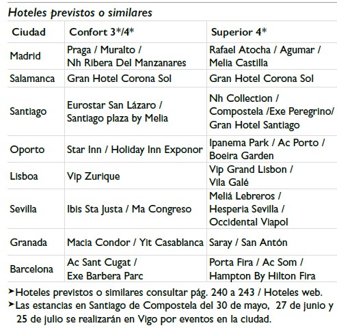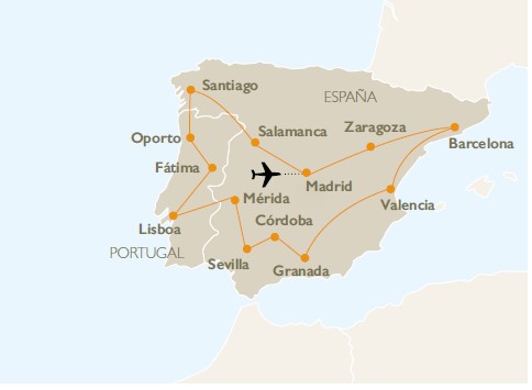 Descubriendo: Madrid (2-3) / Segovia / Ávila / Salamanca (1) / Santiago de Compostela (1) / Viana do Castelo / Oporto (2) / Avéiro / Fátima / Lisboa (2) / Mérida / Sevilla (2) / Córdoba /Granada (1) / Valencia (1) / Barcelona (2) / Zaragoza