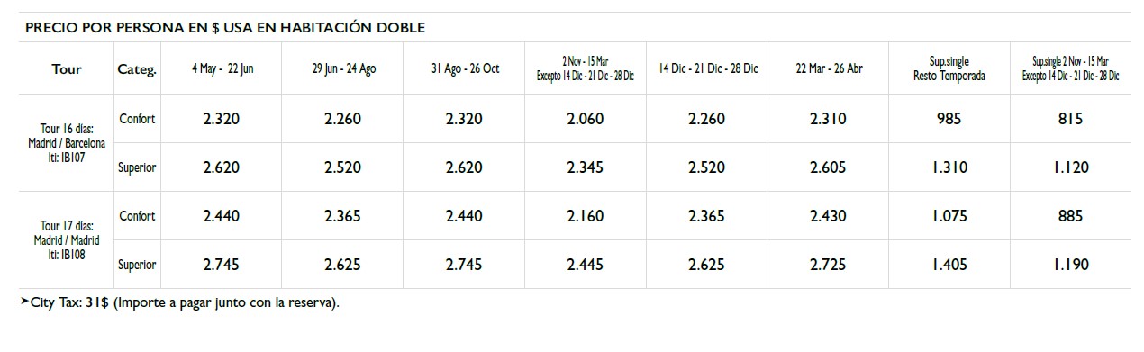 16 ó 17 Días: Madrid / Barcelona ó Madrid: Incluye 11 comidas y 5 extras