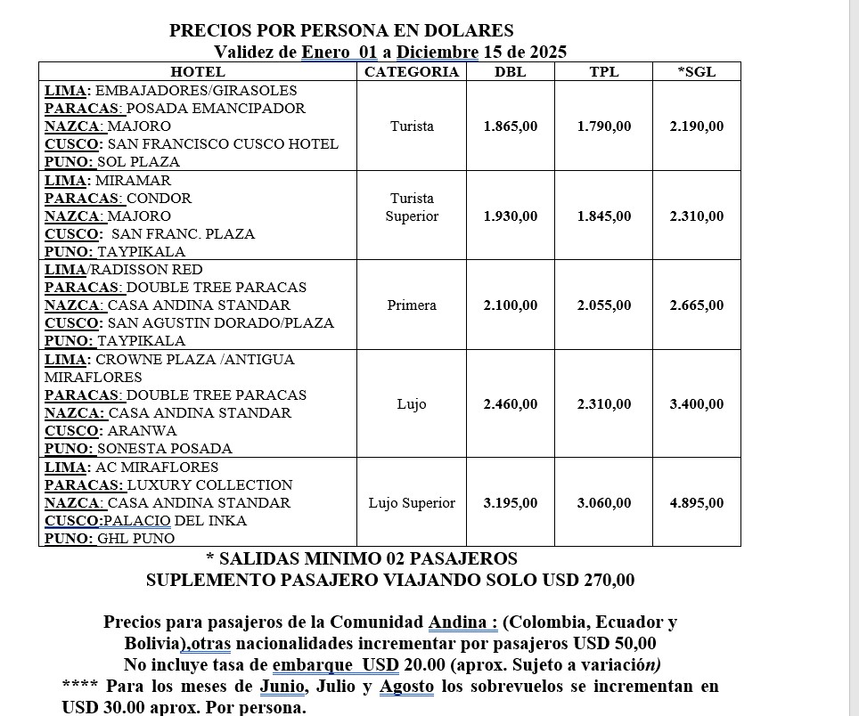 ** Estos precios no aplican en época de ferias, congresos y eventos. Para las siguientes fechas favor consultar tarifas: Semana Santa, Inti Raymi (21 al 27 de Junio), Fiestas Patrias (28 y 29 de Julio), Navidad y Año Nuevo. **
