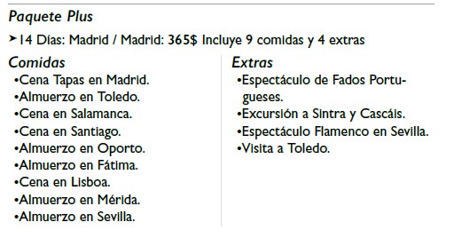 programa. Dichas excursiones serán ofrecidas al consumidor con sus condiciones específicas y precio definitivo de forma independiente, no garantizándose hasta el momento de la posible realización de las mismas. En la mayoría de los programas incluidos en este catálogo se ofrece al consumidor la posibilidad de opcionalmente comprar un paquete de excursiones, visitas y comidas que se ha denominado paquete Plus, cuyo precio y contenido varía en función del programa.