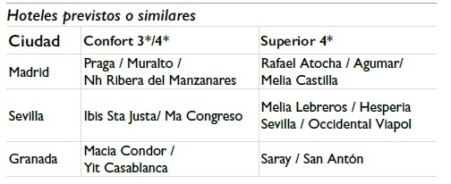 Desayuno buffet y salida salida para hacer la visita de la fabulosa Alhambra y los jardines del Generalife. Después de la visita salida en autobús hacia Madrid. Llegada y alojamiento en el hotel.